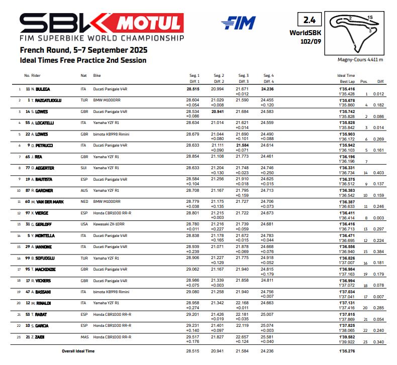 Cette deuxième séance confirme donc la hiérarchie de la matinée, mais avec un resserrement des écarts et des surprises dans le peloton. Ducati semble dominer avec Bulega et Petrucci, tandis que BMW reste menaçant avec Razgatlioglu. Yamaha n’est jamais loin avec Locatelli et Rea, alors que Honda montre de belles choses avec Vierge.