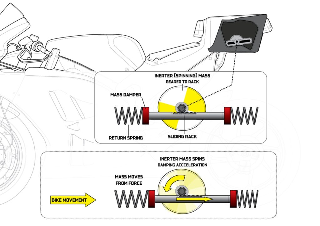 Le mass damper, ou amortisseur de masse, est un système qui aide à stabiliser la moto pendant l’accélération et le freinage. Ducati l’a expérimenté pour réduire les vibrations et améliorer la traction, surtout lors des sorties de virage et freinages appuyés.